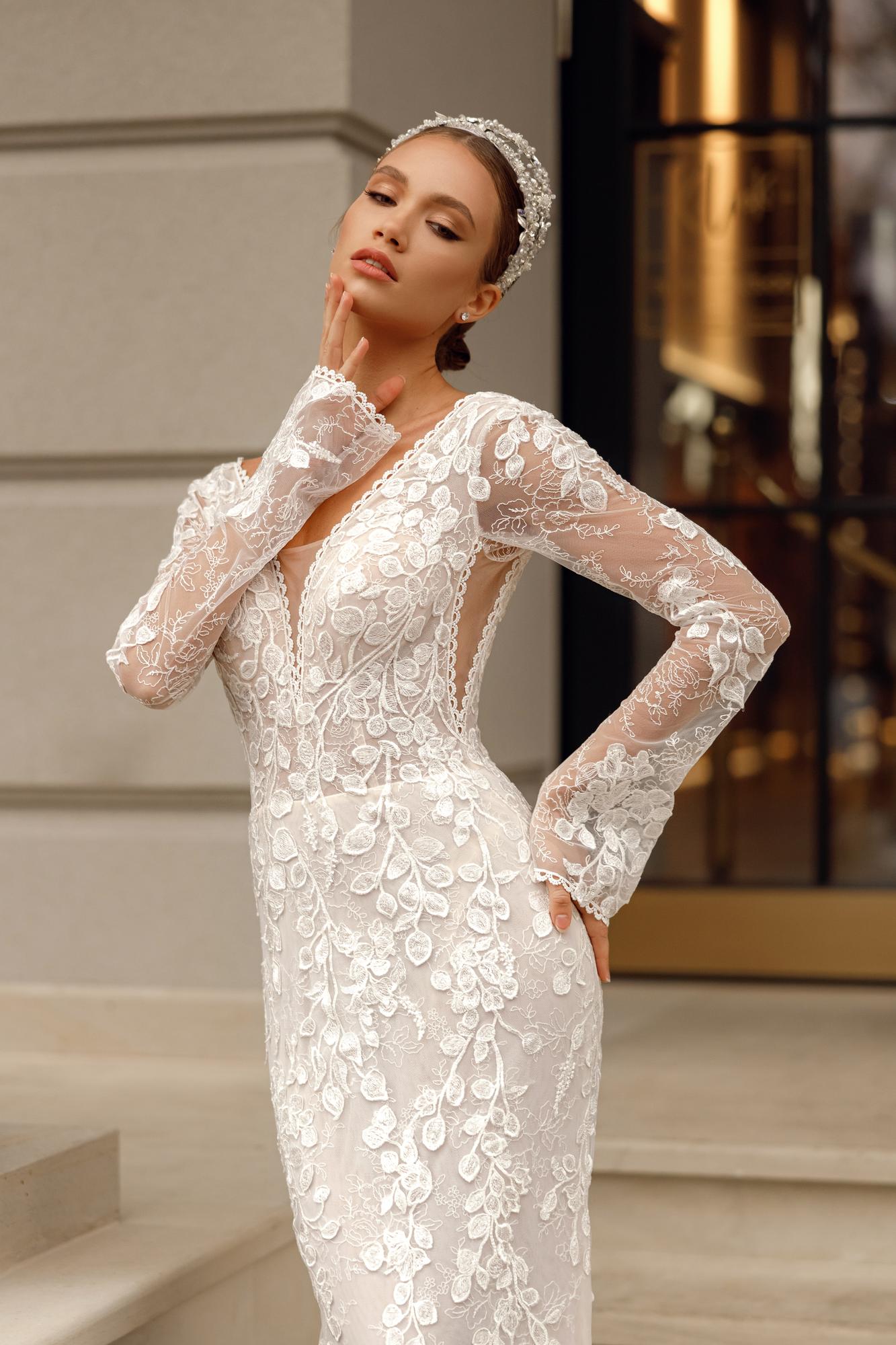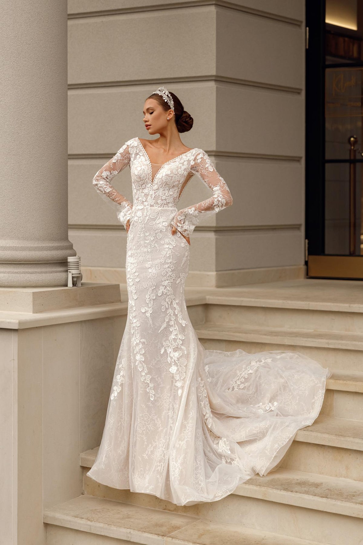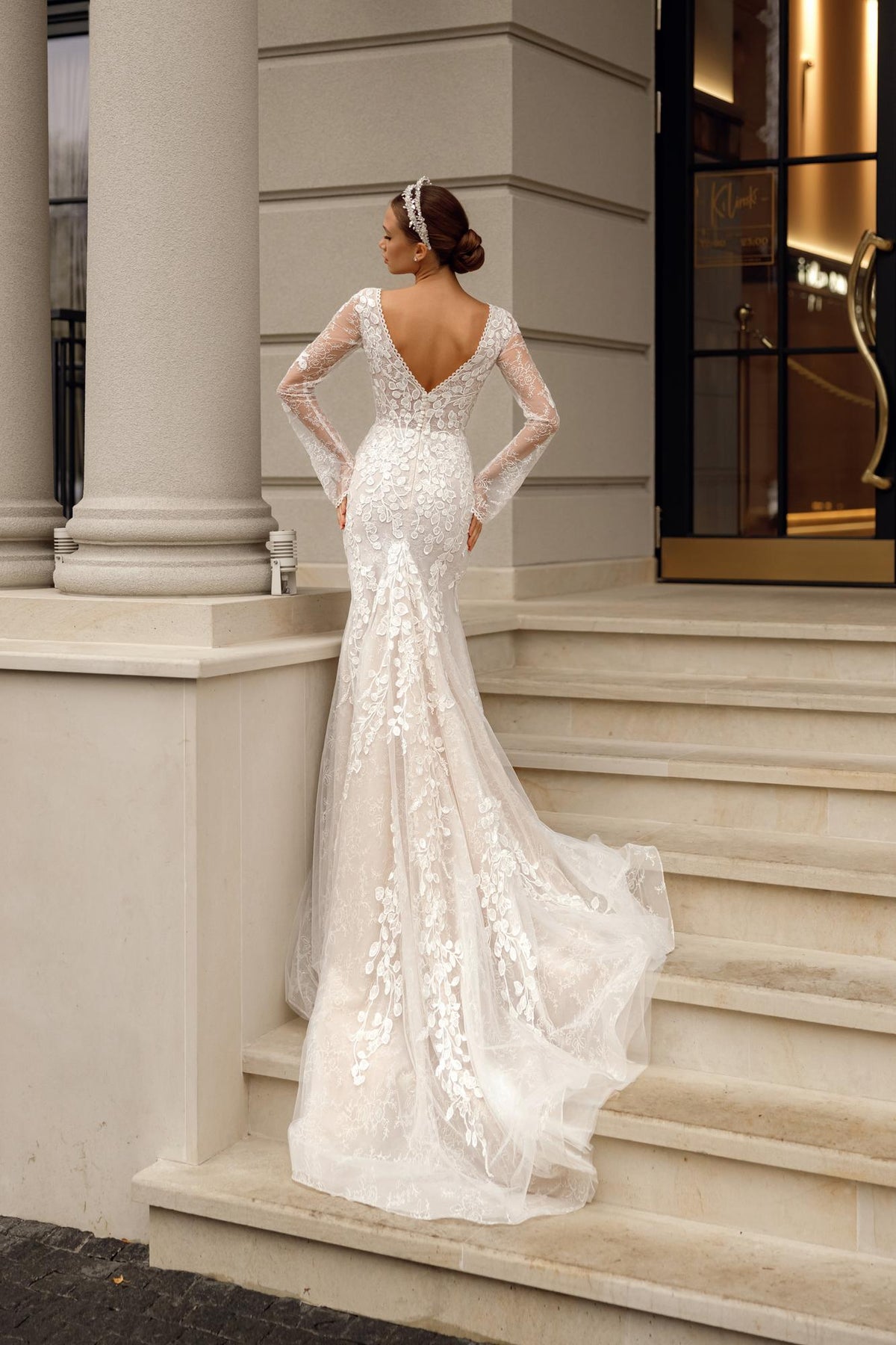 Hanny is a refined mermaid wedding dress created for the bride who loves intricate lacework, elegant structure and soft romantic texture. Designed in a light nude shade, the gown is completely covered with Chantilly and lace embroidered with sequins, creating a gentle shimmering effect that enhances the silhouette with subtle radiance.