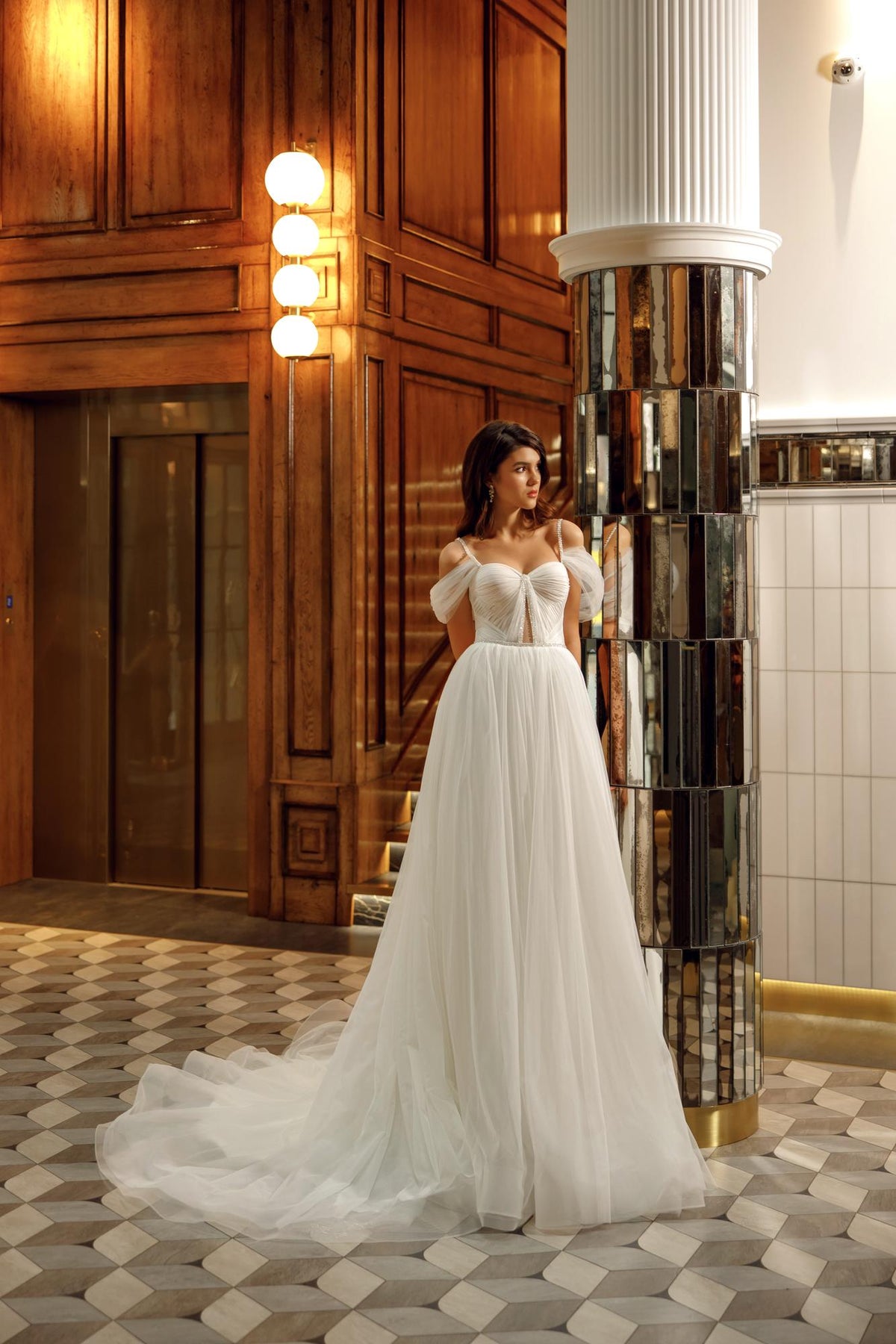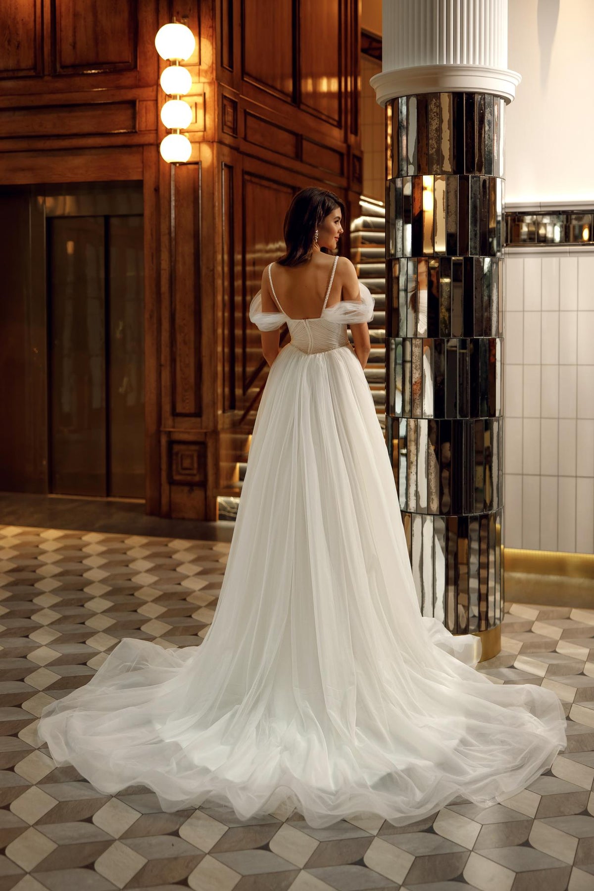 The tulle skirt flows effortlessly, offering airy movement and timeless romantic charm. With its blend of soft textures and radiant embellishment, Letizia is perfect for brides seeking modern luxury with classic grace.