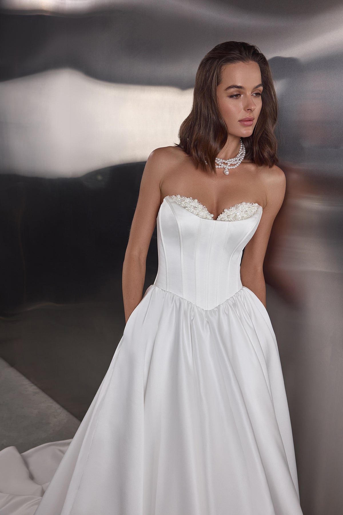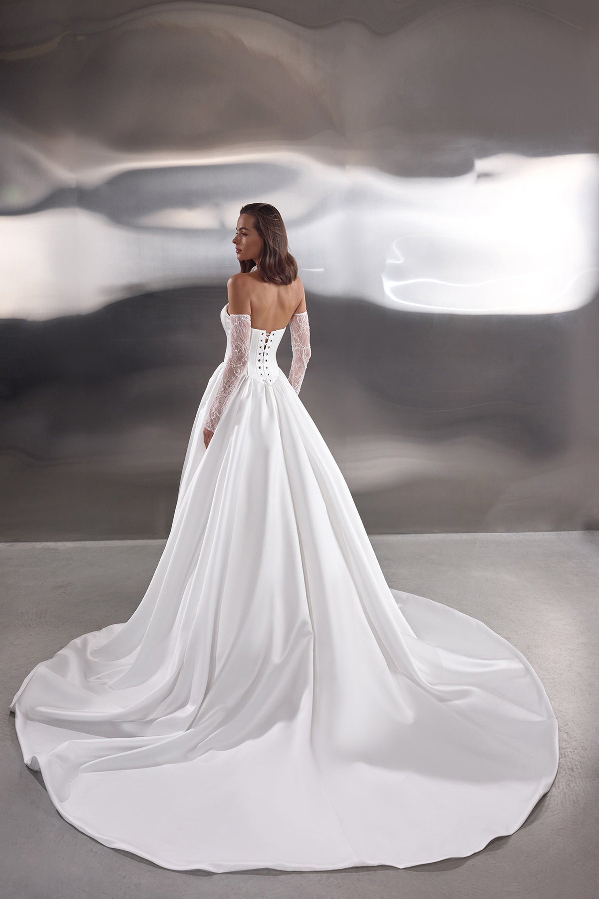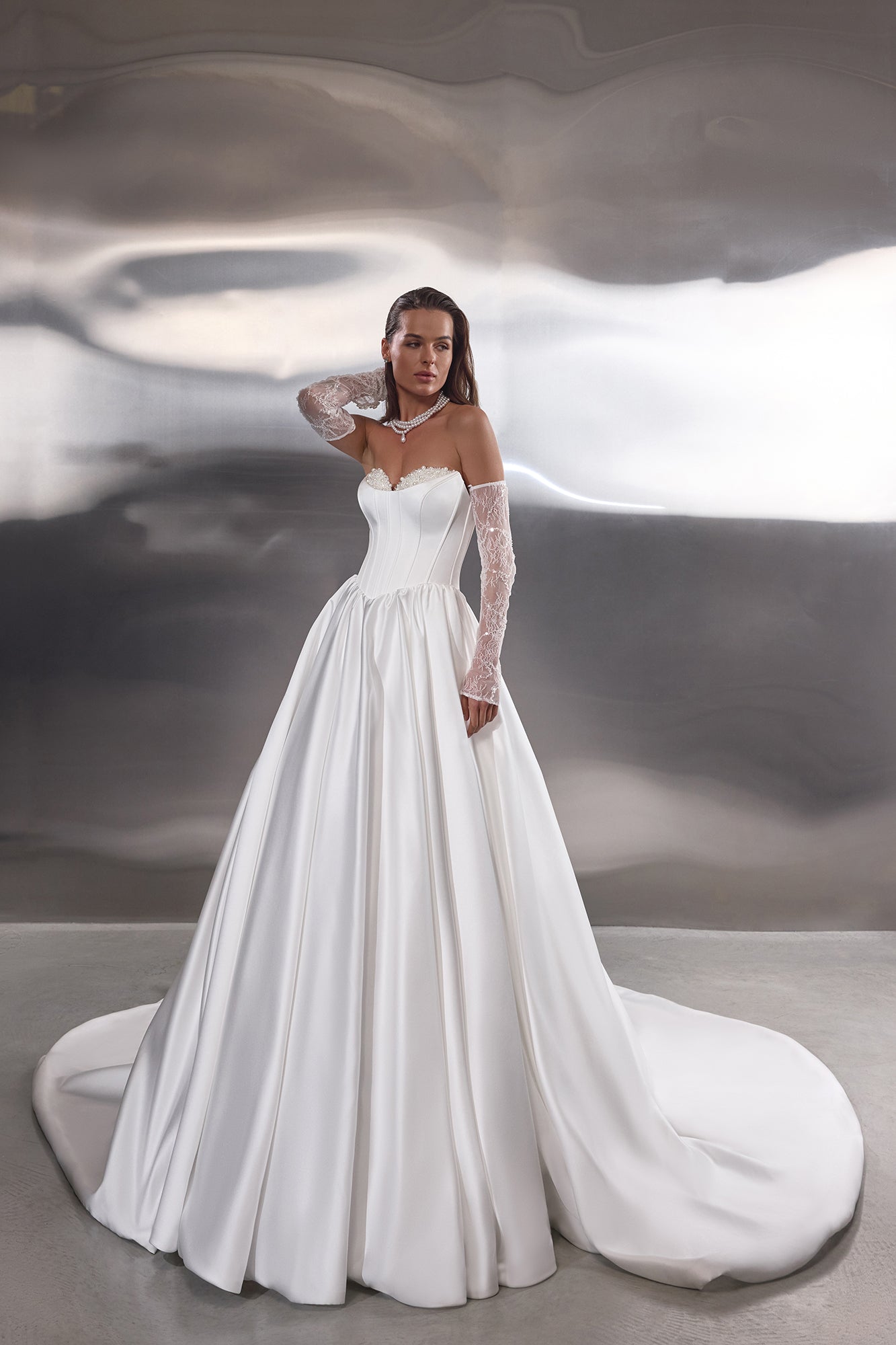The minimalist décor is elevated with delicate pearl, stone and crystal embellishment that adds subtle shimmer without overpowering the simplicity of the design. Removable lace sleeves introduce a romantic layer of texture, offering versatility and allowing the look to transition beautifully from ceremony to celebration.
