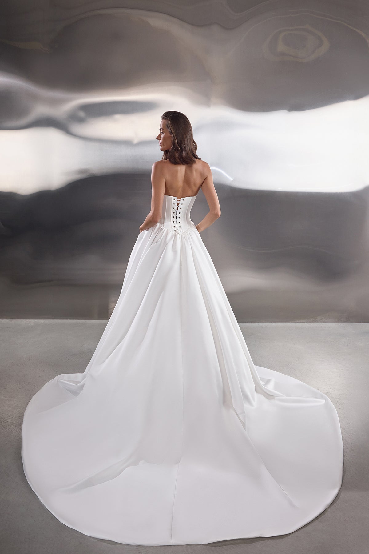 Nikkie is an elegant A-line wedding dress designed for the bride who loves minimalist luxury with refined, feminine detail. Crafted from smooth ivory satin, the gown creates a sculptural silhouette with graceful volume and a clean, contemporary finish.