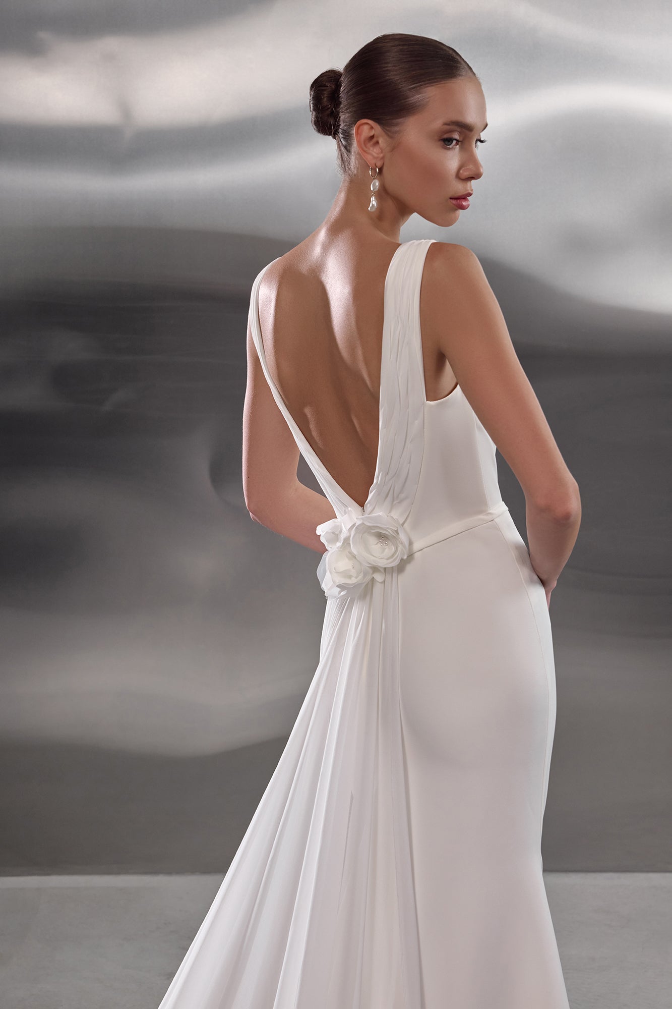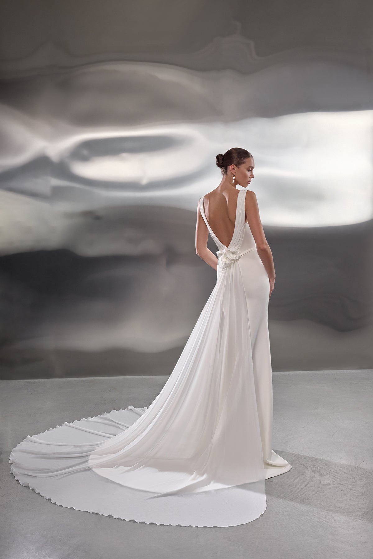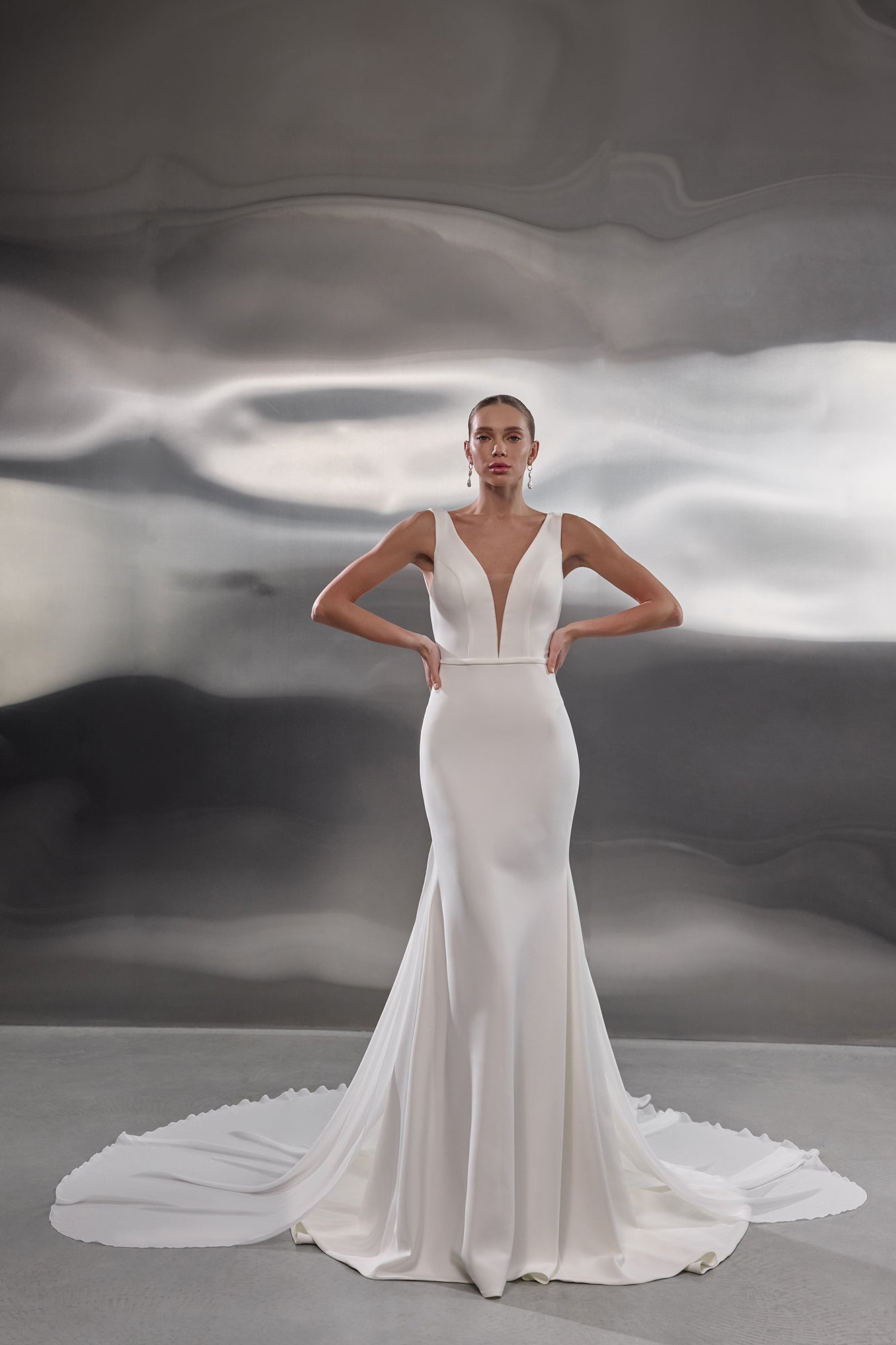 Piper is a sleek mermaid wedding dress designed for the bride who values clean lines, modern elegance and refined simplicity. Crafted from luxurious ivory stretch crepe satin, the gown sculpts the figure with a smooth, polished finish that feels effortlessly sophisticated.