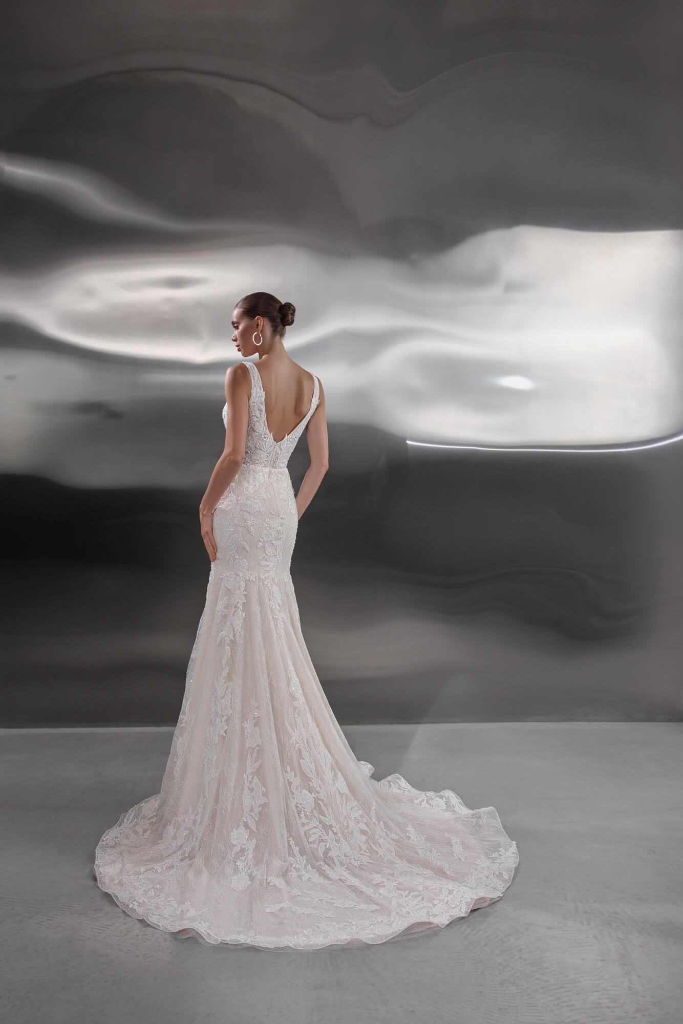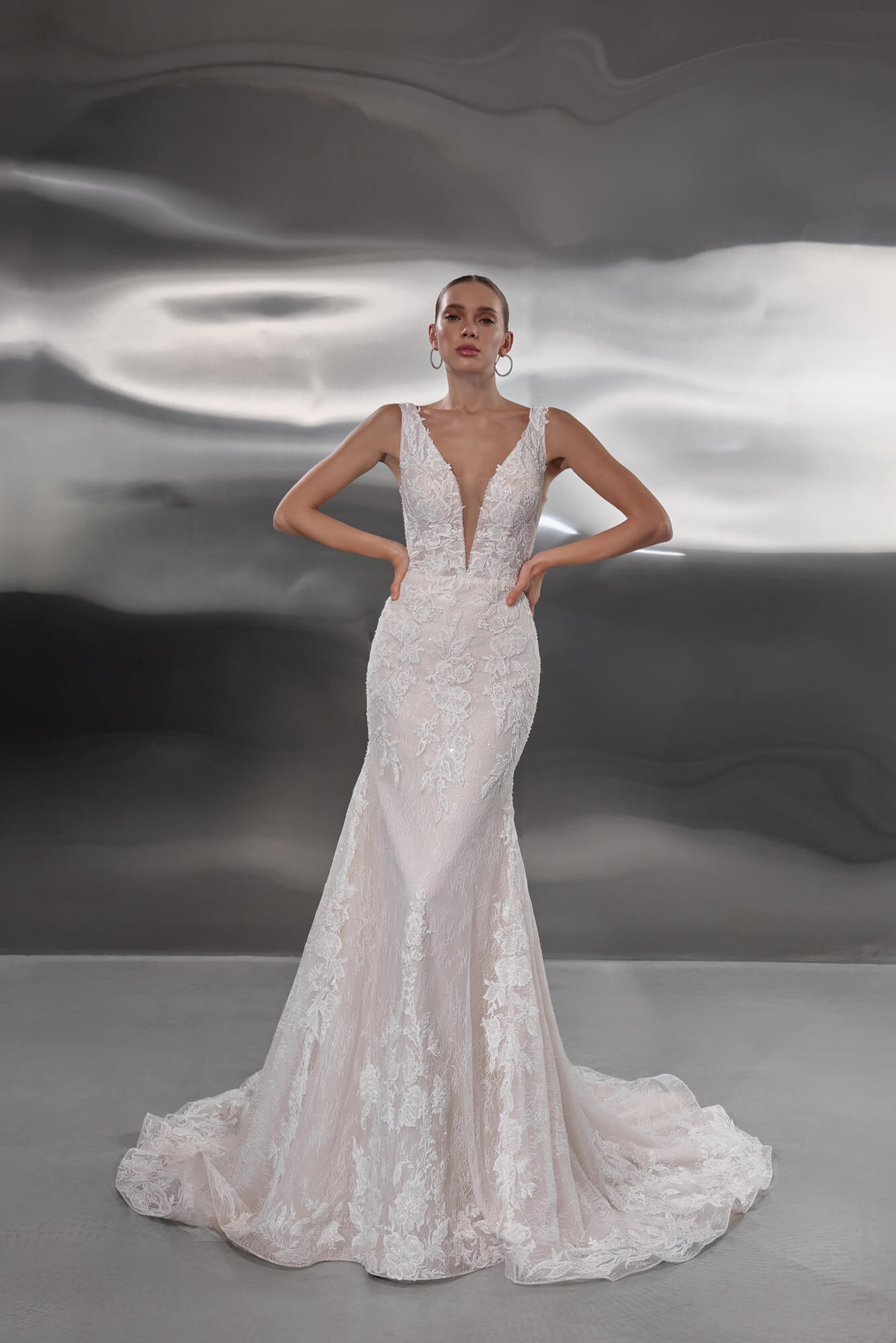 Rowan is a refined mermaid wedding dress created for the bride who loves sculpted elegance paired with romantic lace detail. Designed in a soft light nude shade, the gown is generously decorated with floral lace that is intricately embroidered with beads and sequins, creating a luminous, textured finish that enhances the silhouette.