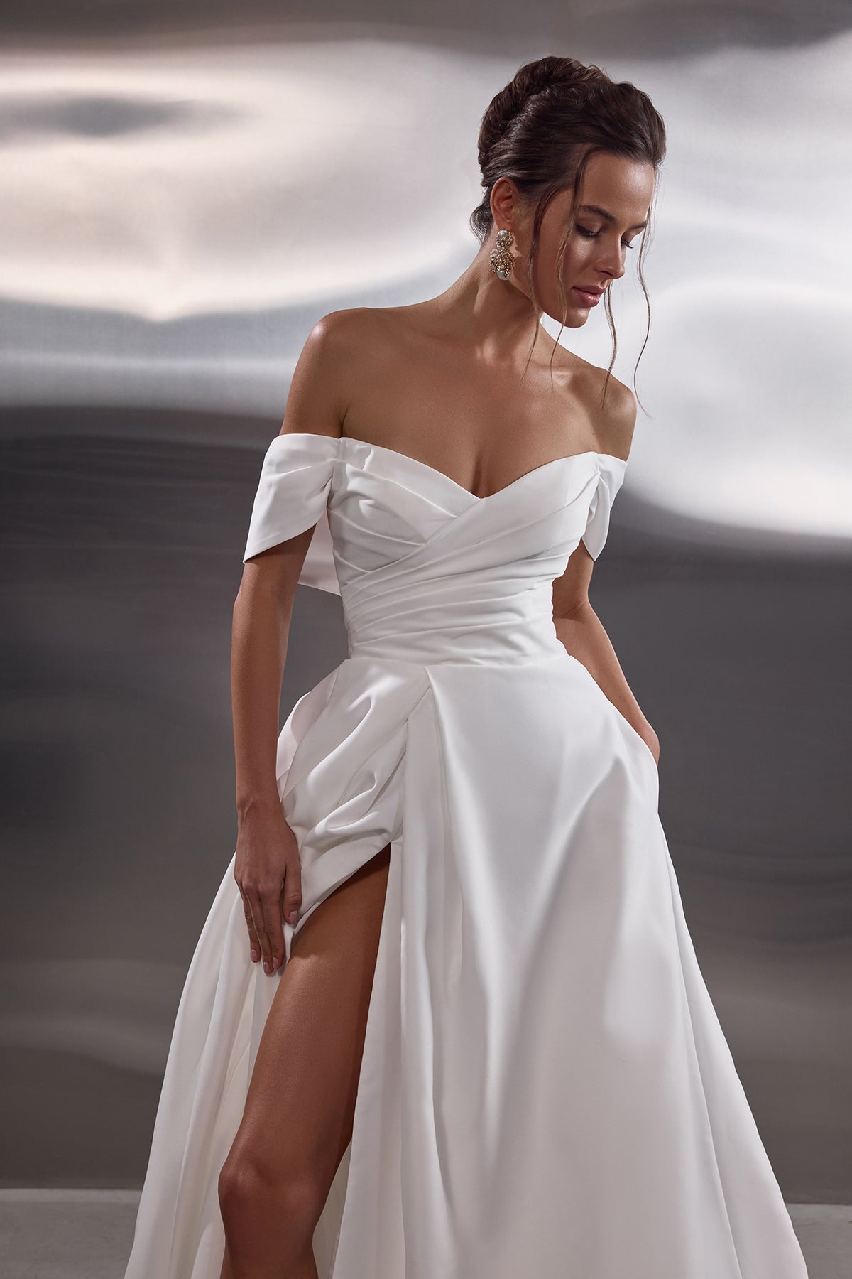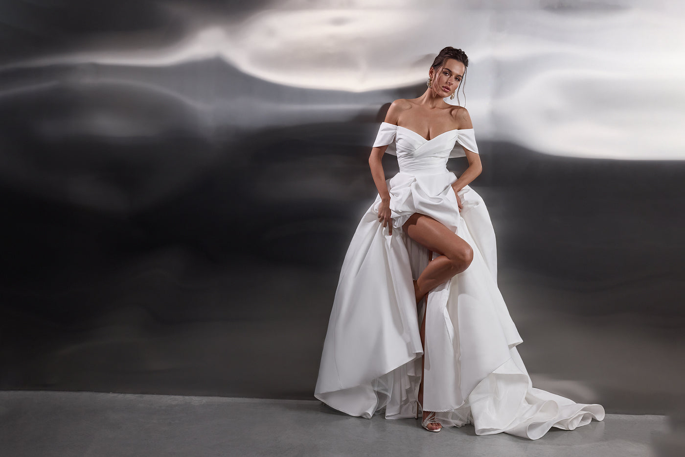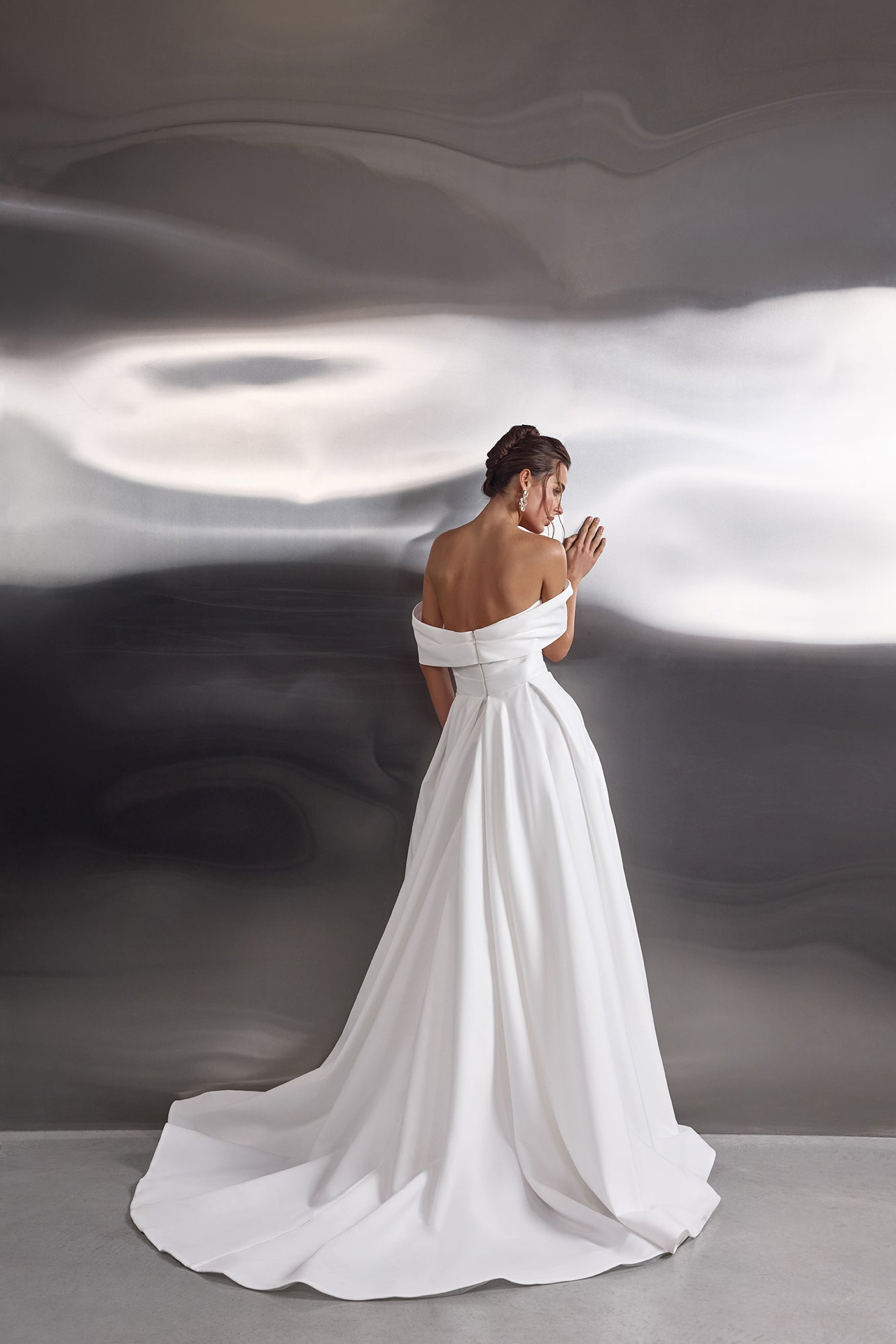 Samantha is a striking ballgown style wedding dress designed for the bride who loves bold volume balanced with clean, minimalist elegance. Crafted from luxurious ivory satin, the gown creates a sculptural silhouette that feels modern, confident and effortlessly refined.