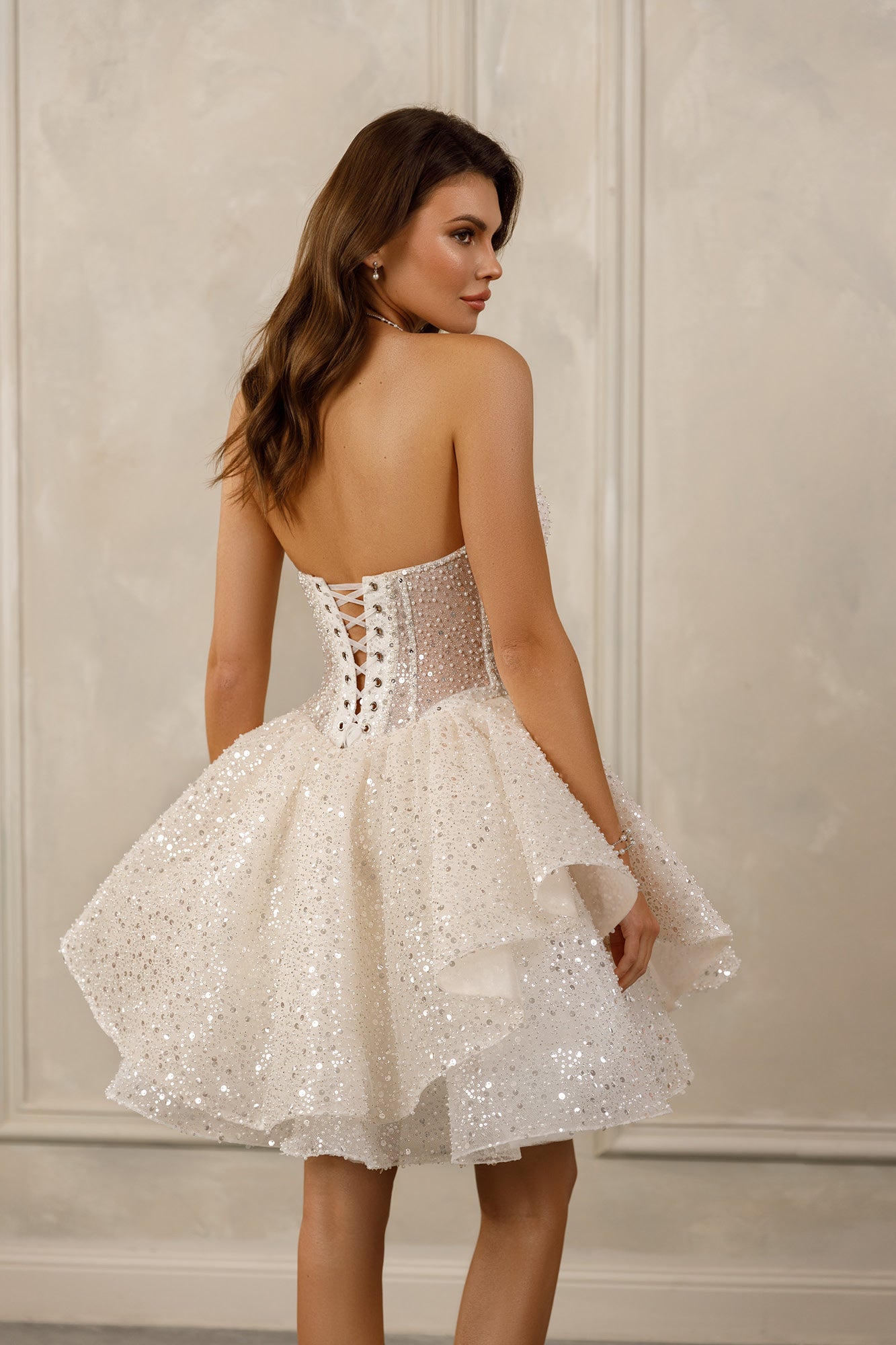 Deila is a bridal dress is designed for the modern bride who appreciates refined detail and effortless versatility. The soft light nude tone creates a contemporary, fashion led look while generous beadwork, pearls and sequins add a radiant, couture inspired finish.