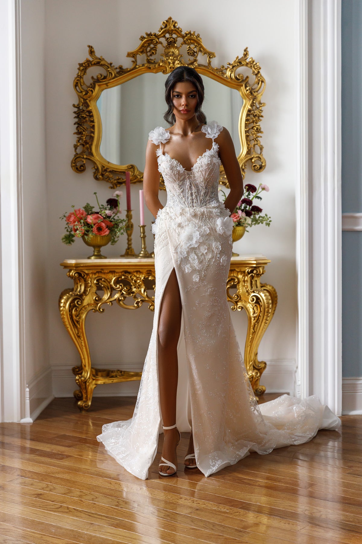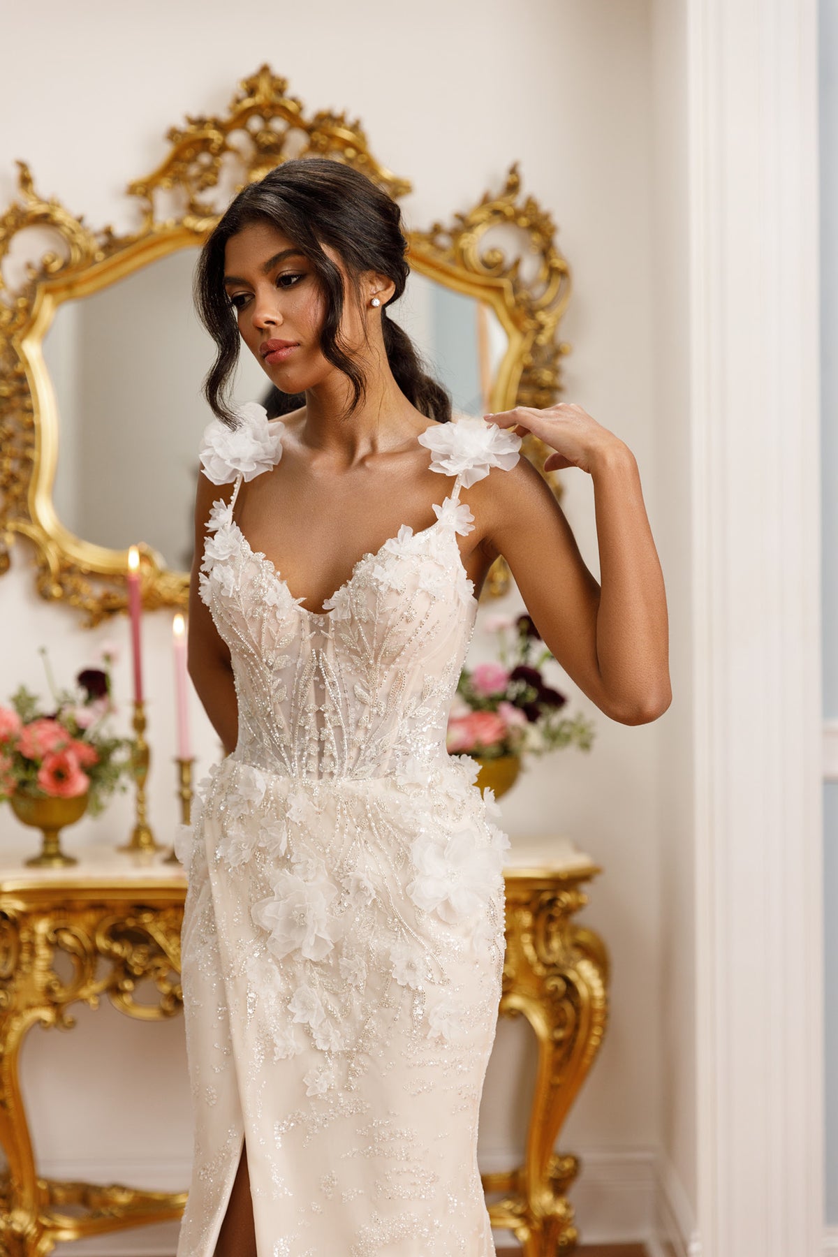 Thin straps embellished with matching 3D flowers frame the neckline beautifully, creating a feminine and romantic finish. The tulle skirt flows seamlessly from the fitted silhouette and features a contemporary slit that adds confident movement and a fashion forward touch.