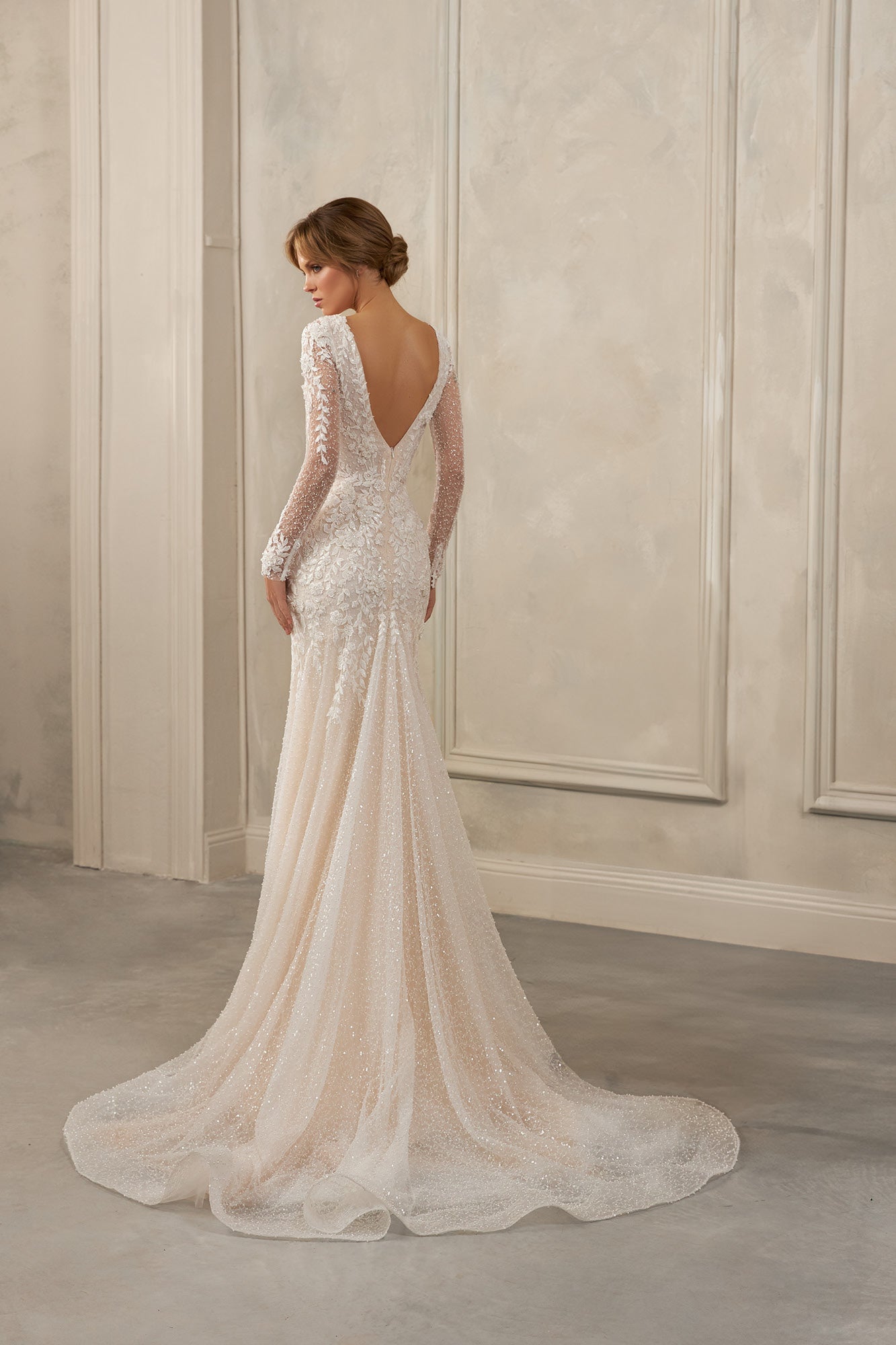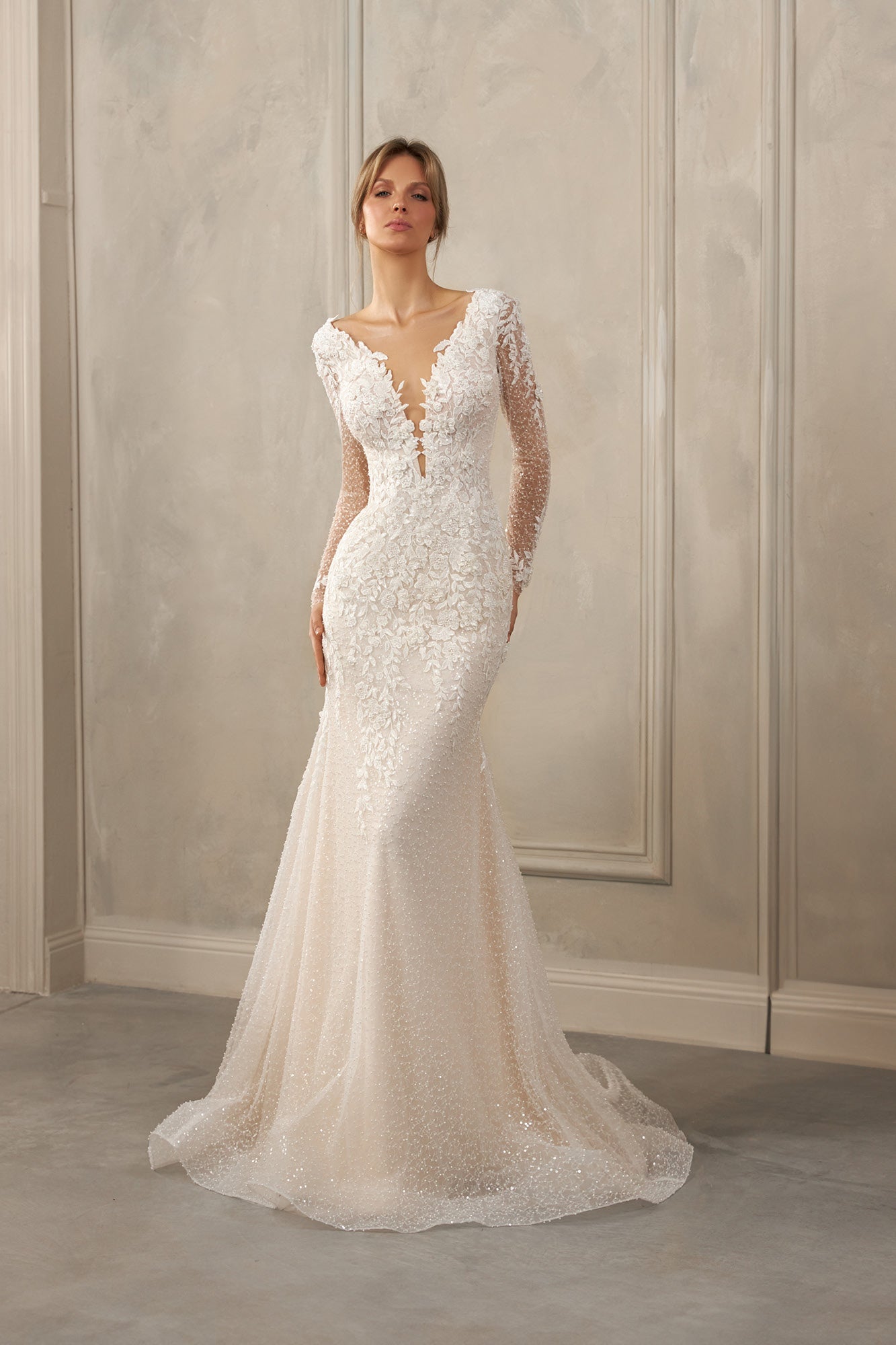 Bead and sequin embroidery adds a luminous, delicate sparkle that enhances every detail without overwhelming the sleek mermaid shape. Long sleeves balance the gown with sophistication and create a graceful, timeless finish.