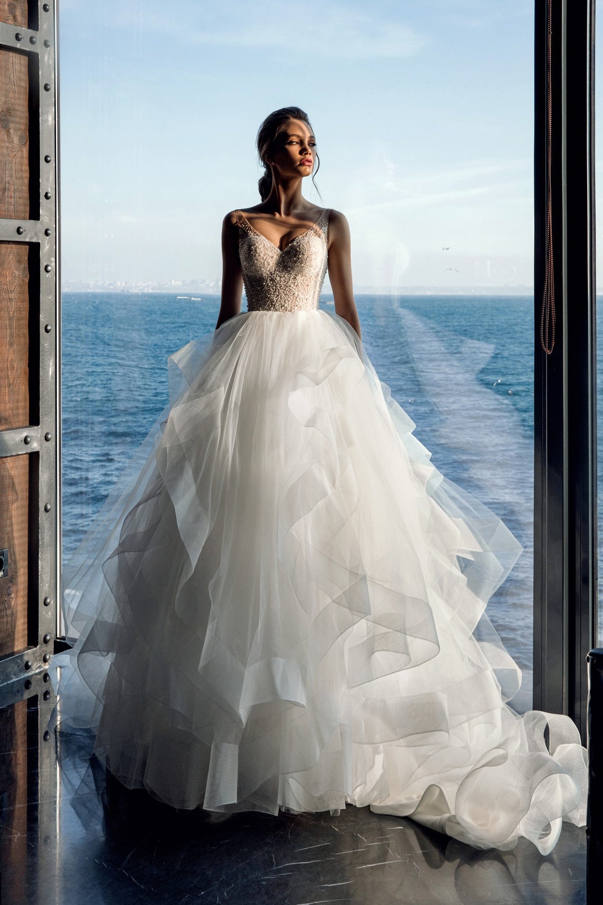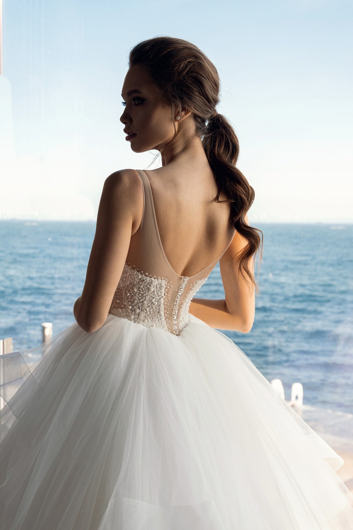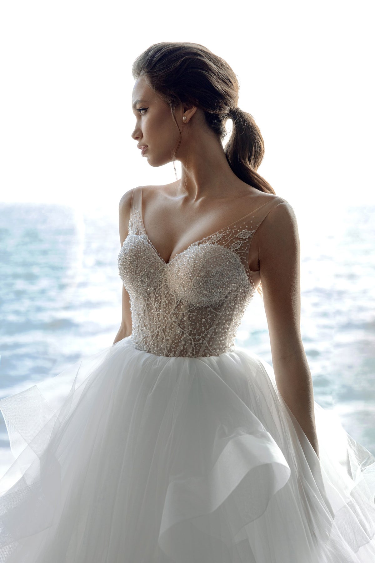 The skirt is a cascade of soft tulle layers, each one floating and folding to create volume with effortless movement. The airy, cloud like texture gives Angeline a modern fairytale quality that feels both artistic and luxurious. This is a gown designed for the bride who wants presence, elegance, and unforgettable beauty.