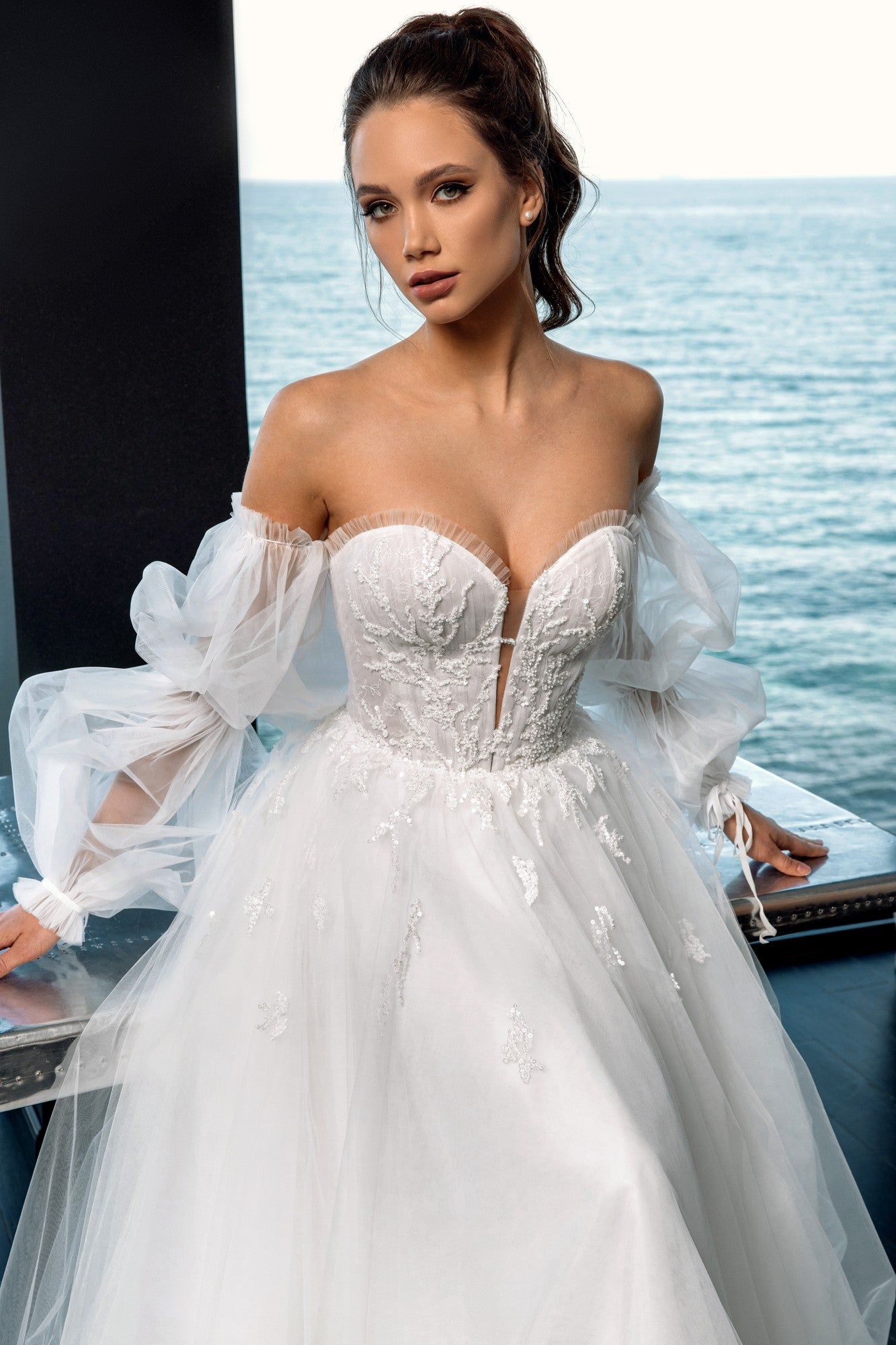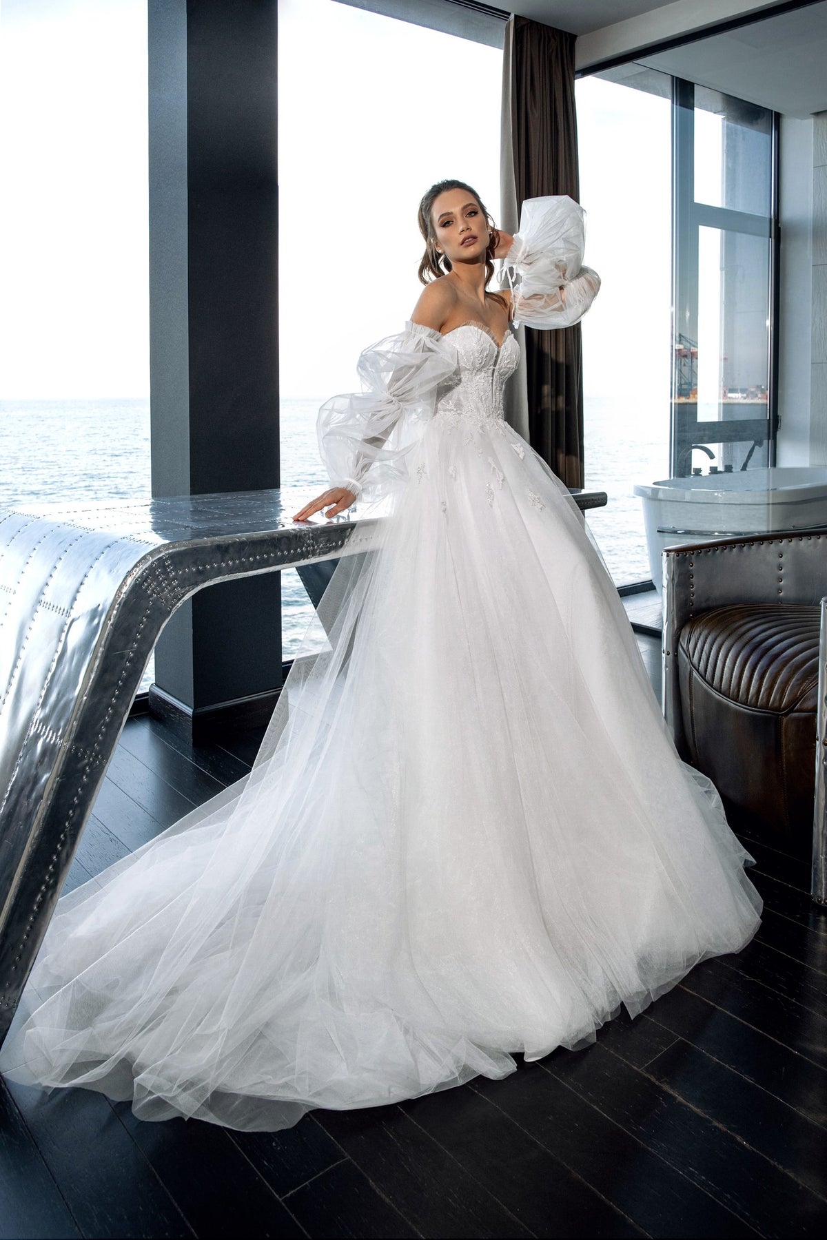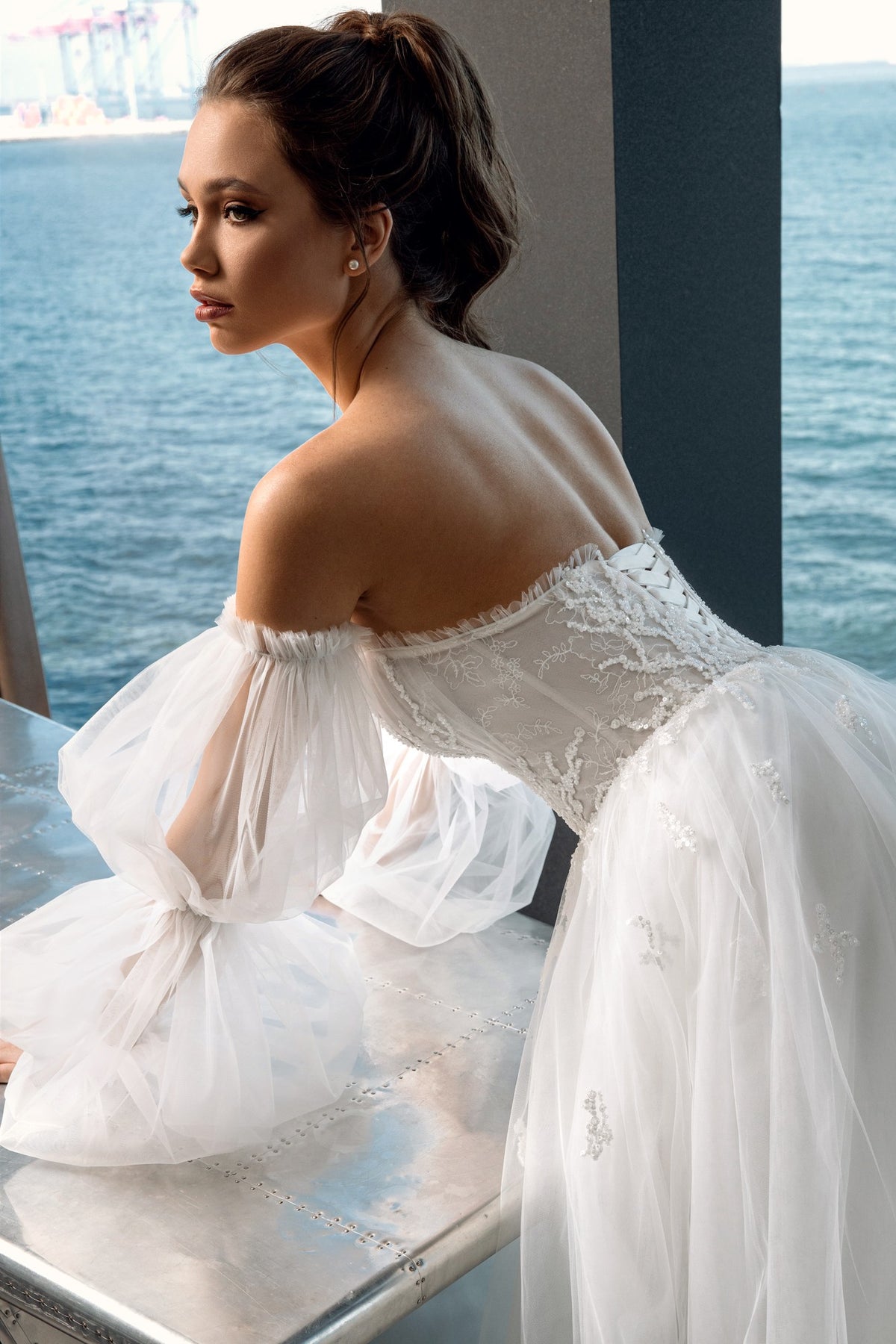 June is a statement of soft drama and couture artistry. The gown features a delicately structured bodice adorned with embroidery that highlights the neckline and waist with refined detail. Romantic off shoulder sleeves in airy gathered tulle create a cloud like silhouette around the arms, adding movement and texture that feel effortlessly ethereal.