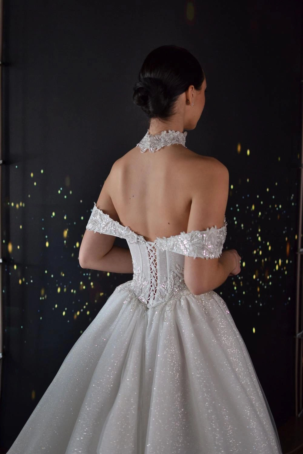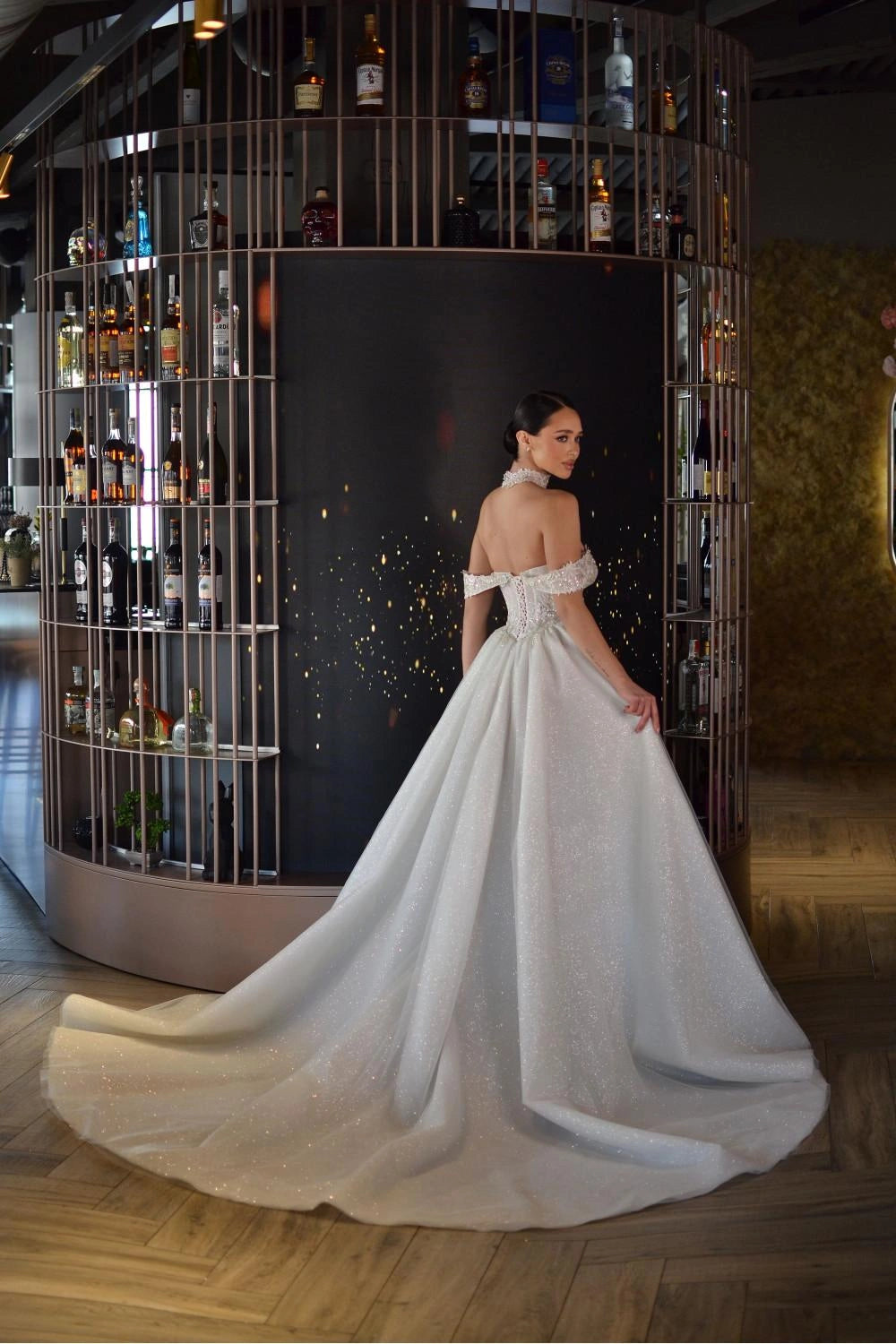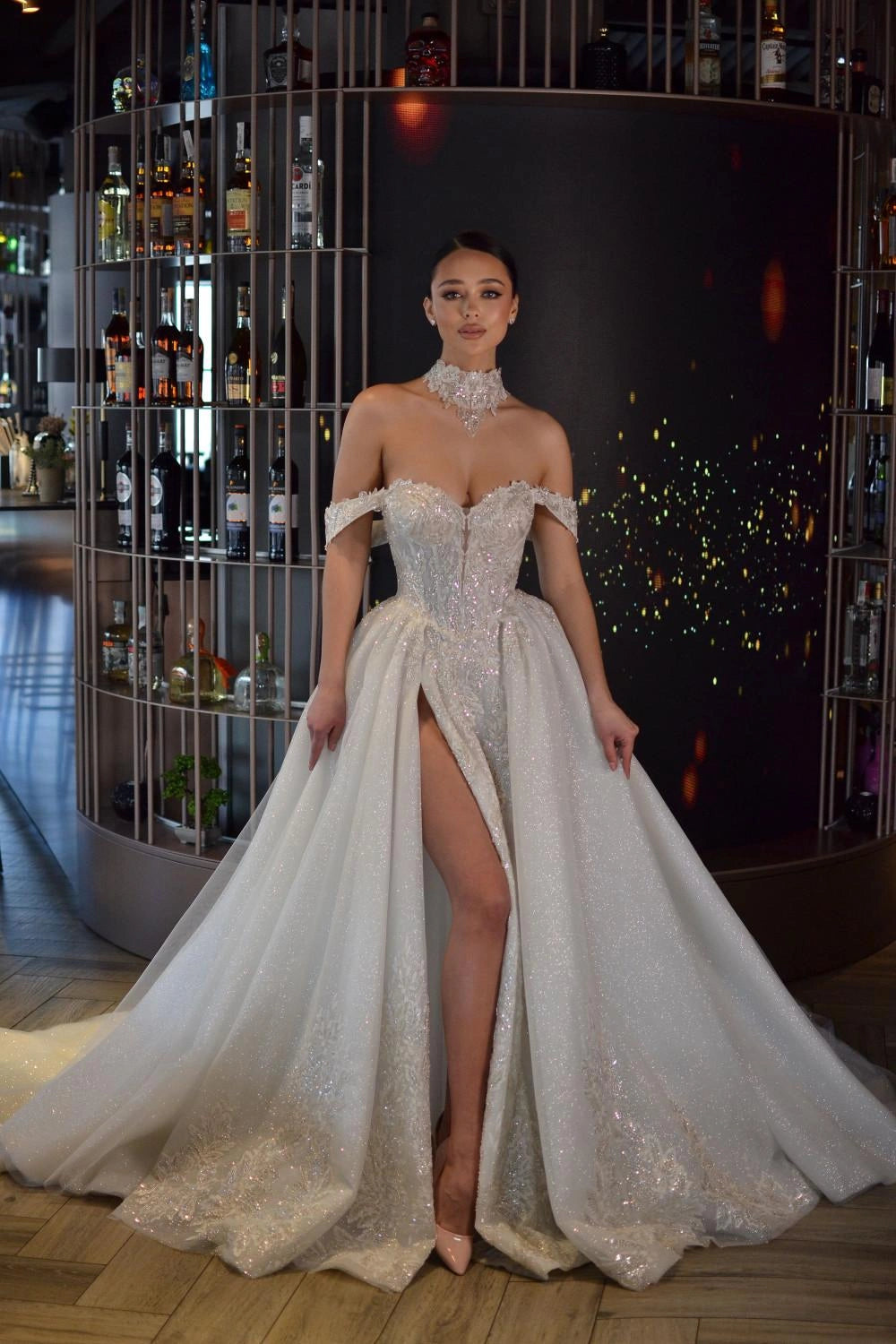 Scarlett is a show stopping masterpiece crafted for the bride who wants pure drama with couture level elegance. The structured bodice shimmers with intricate beadwork that catches every glimmer of light, framed by soft off shoulder straps that add a touch of romance. The sculpted neckline creates a powerful, feminine silhouette that feels both modern and undeniably luxurious.