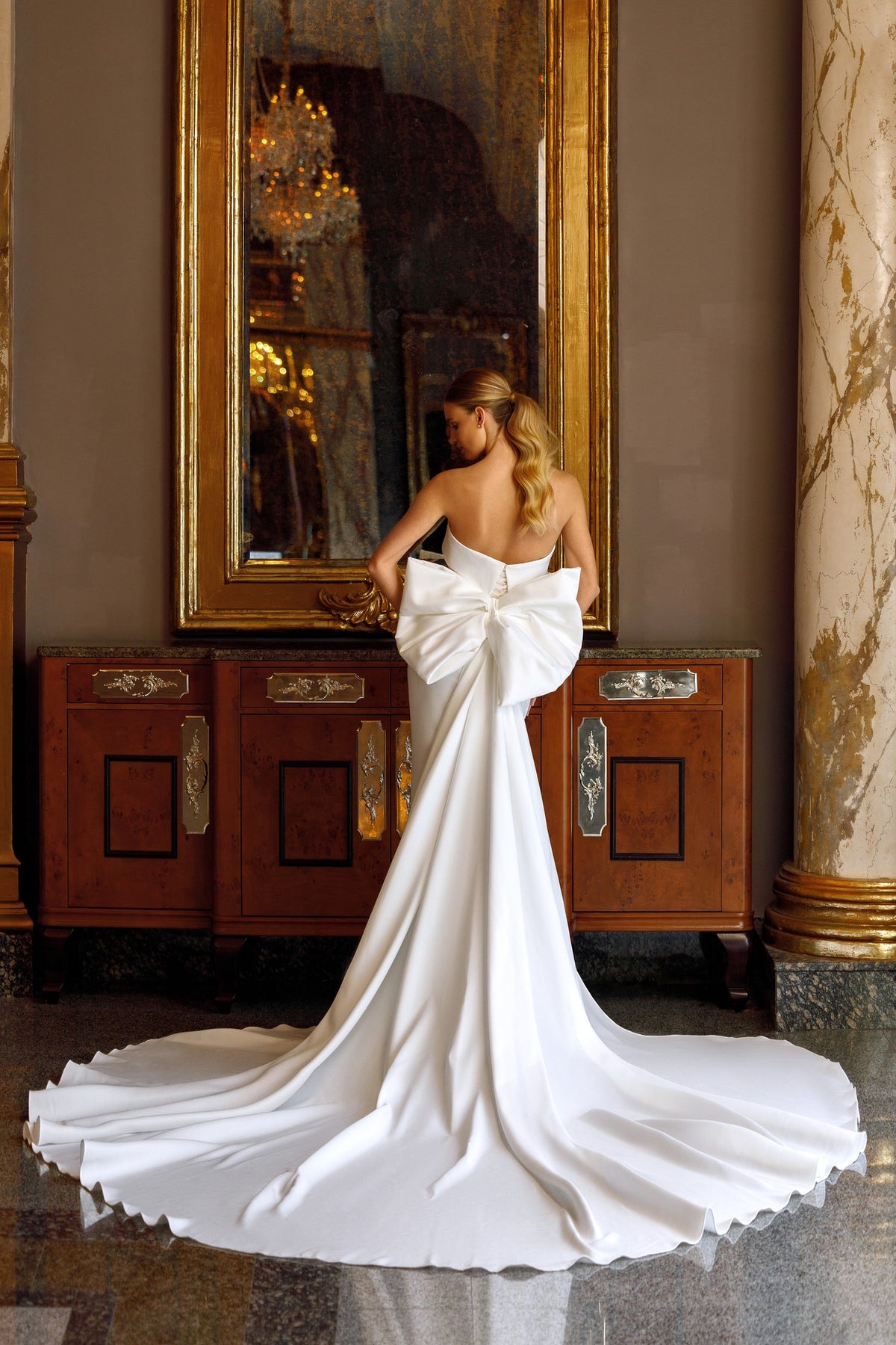 The look is elevated with a detachable satin train finished with a voluminous bow. This allows the bride to switch between a sleek, minimalist style and a statement moment with added drama.