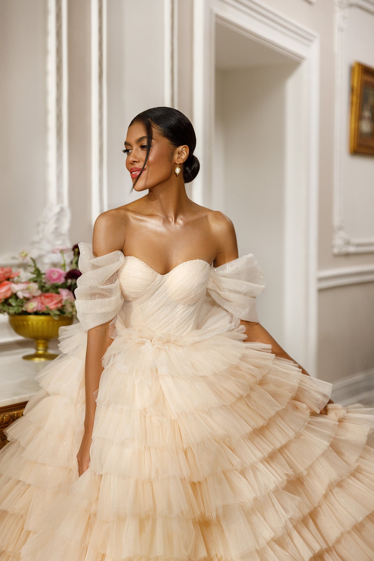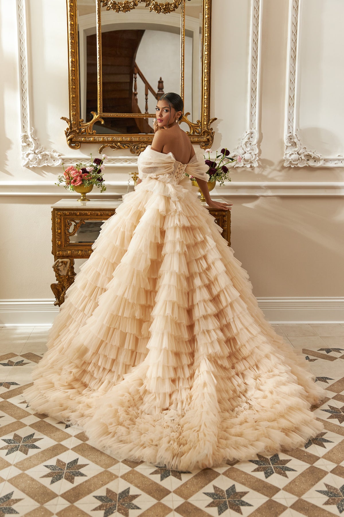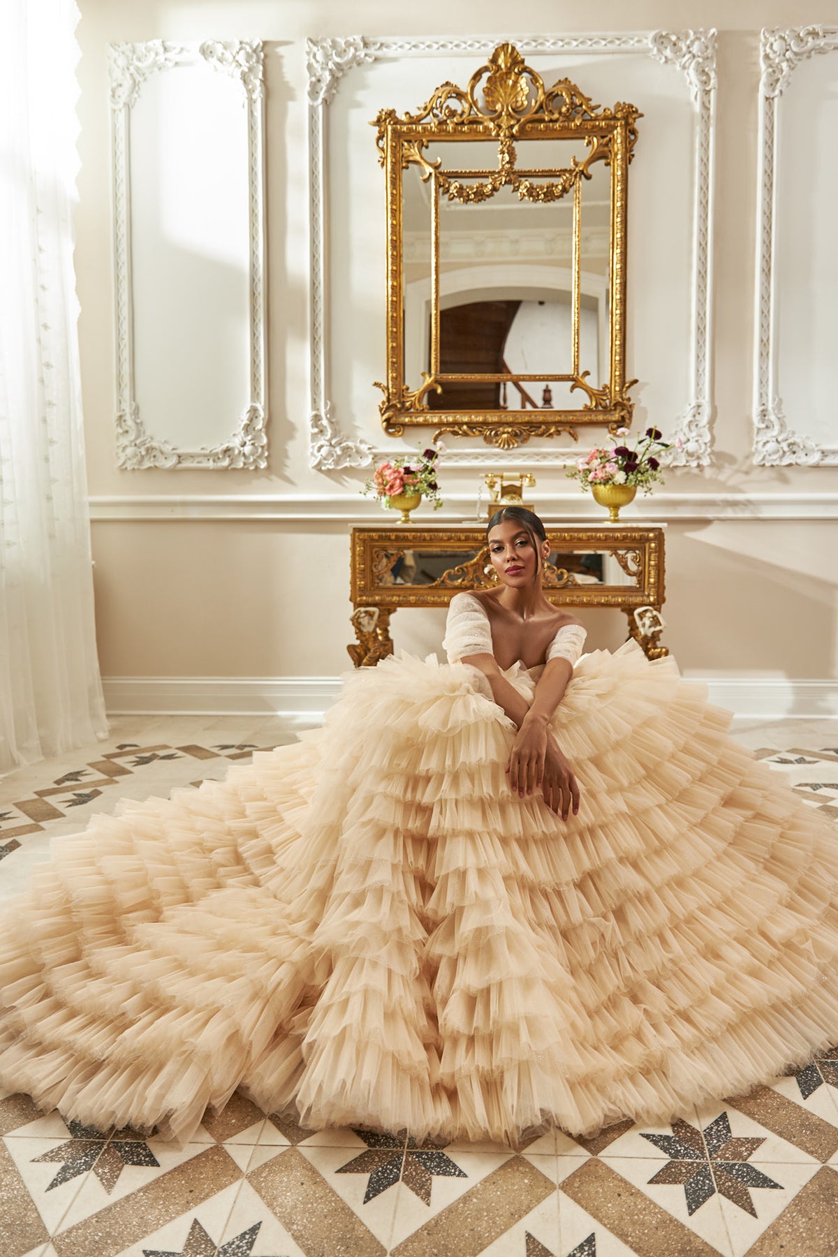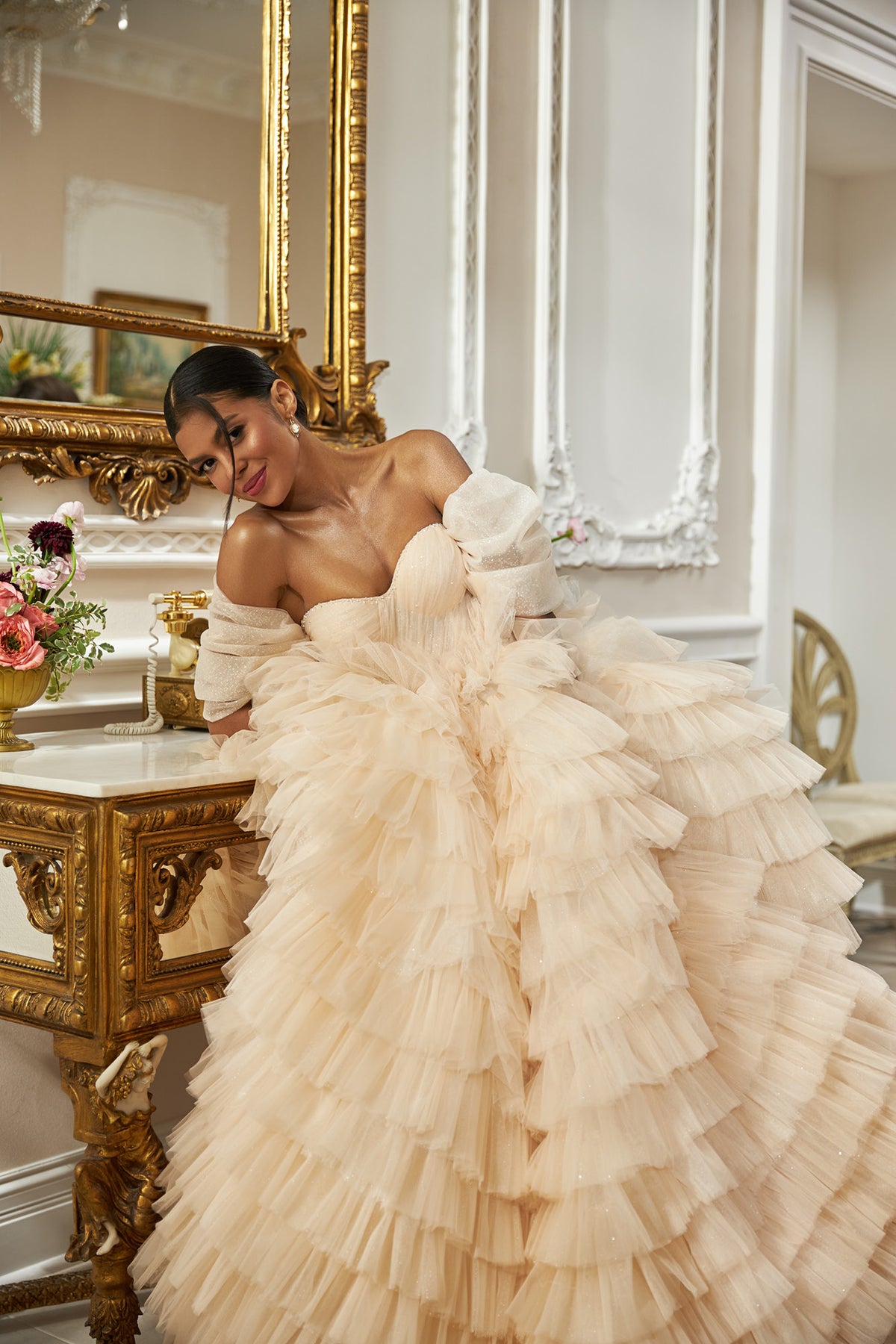 The voluminous nude skirt is adorned with airy ruffles that float effortlessly, adding drama and lightness in perfect balance. Alexandra is the ideal choice for brides seeking a statement gown full of texture, brilliance and modern fairy tale charm.