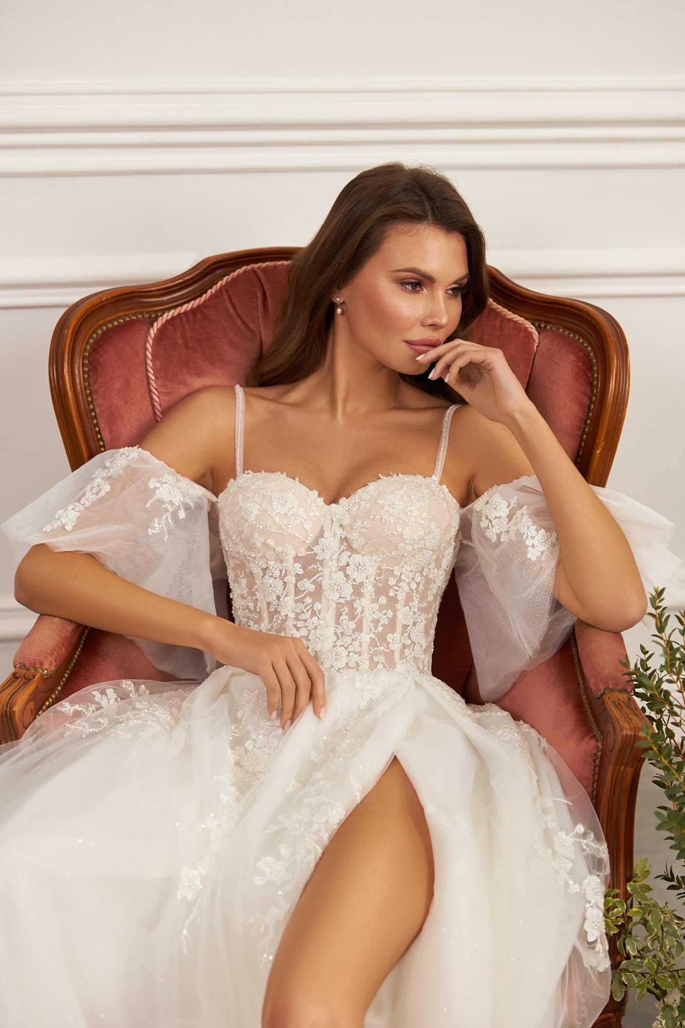 Alexandra is a breath taking princess style wedding gown created for the bride who dreams of grandeur, romance and modern couture sparkle. The semi transparent nude corset is covered in fine glitter and finished with delicate draping that adds softness and movement across the bodice.