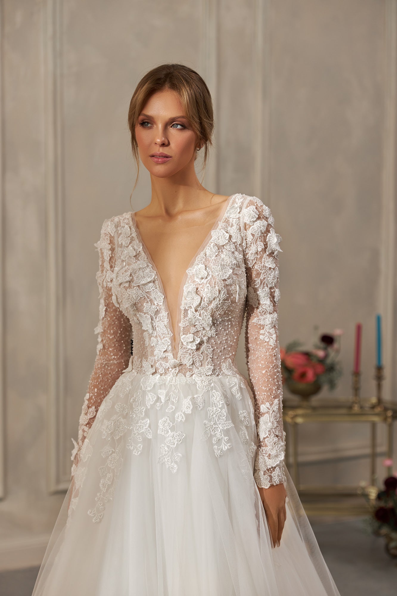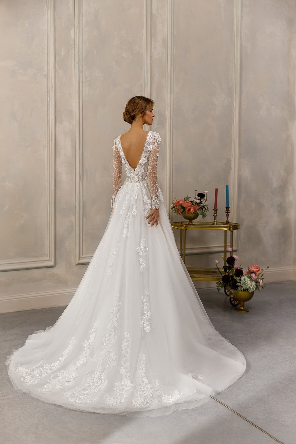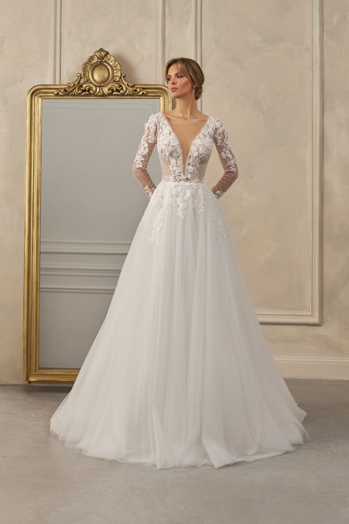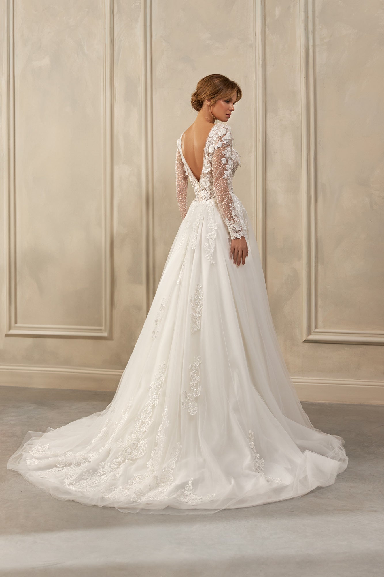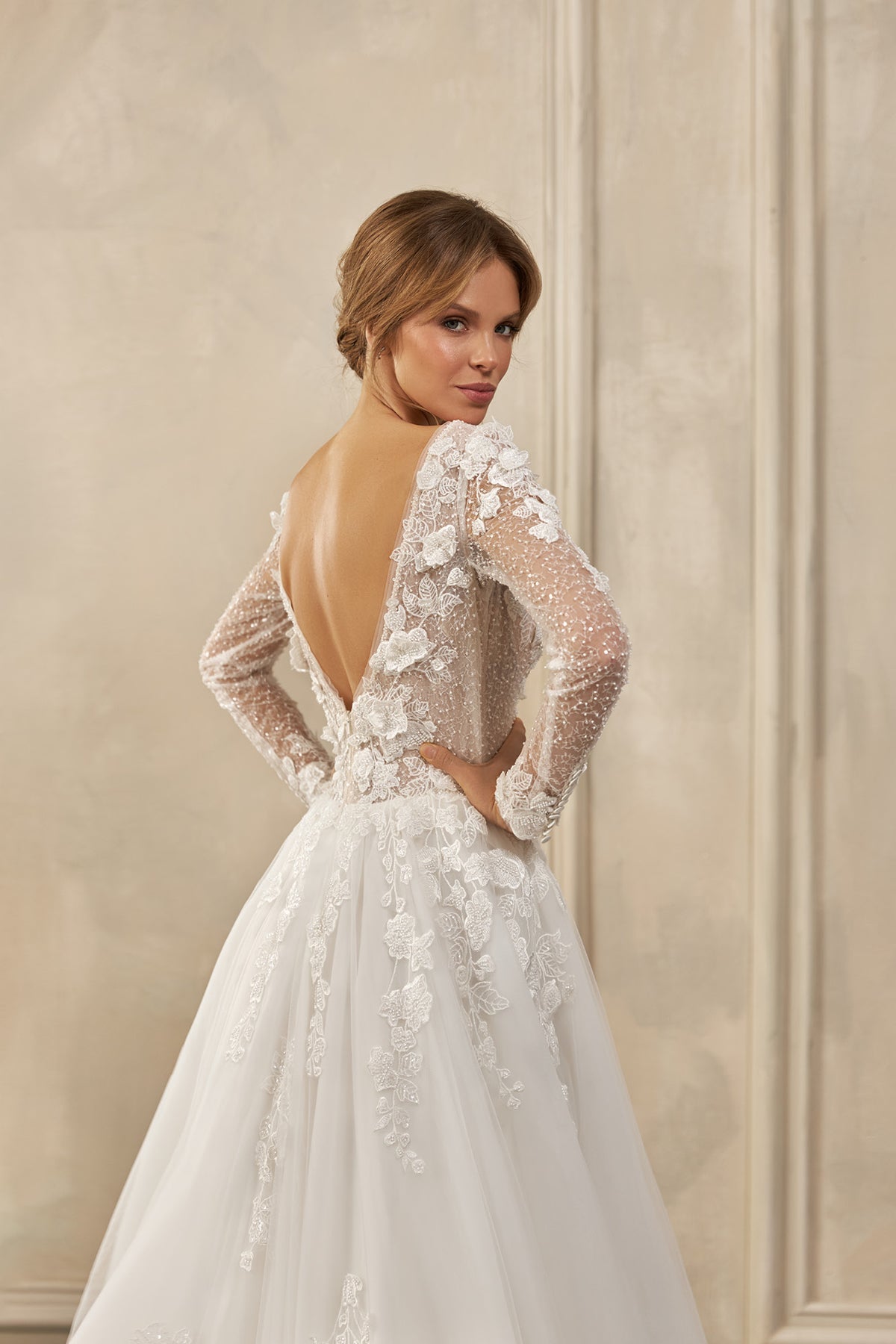 Beads and sequins enrich the design with refined sparkle, while delicate 3D flowers add sculptural beauty and artistic depth to the bodice. The long sleeves enhance the silhouette with timeless sophistication and a light, ethereal finish.