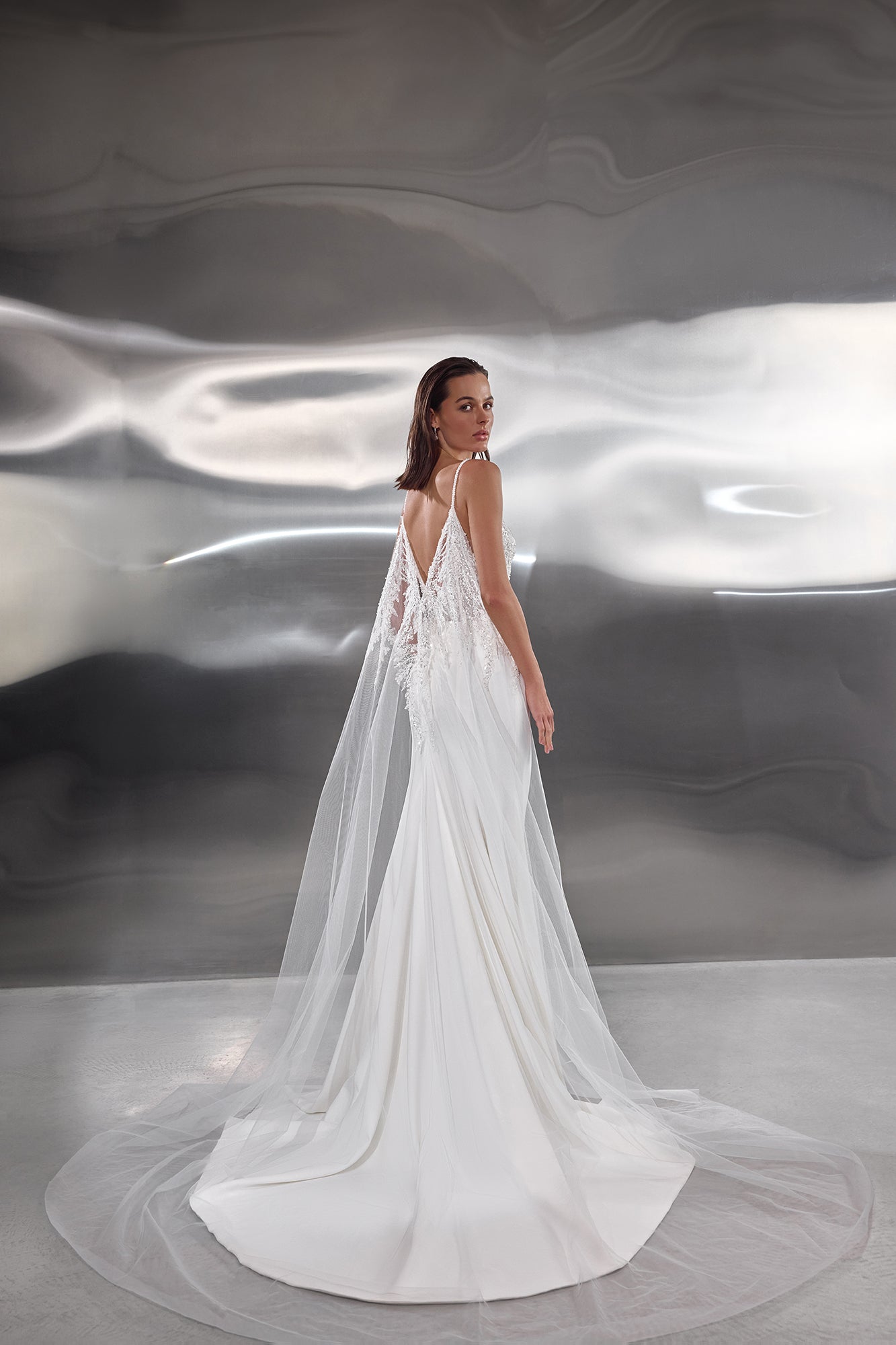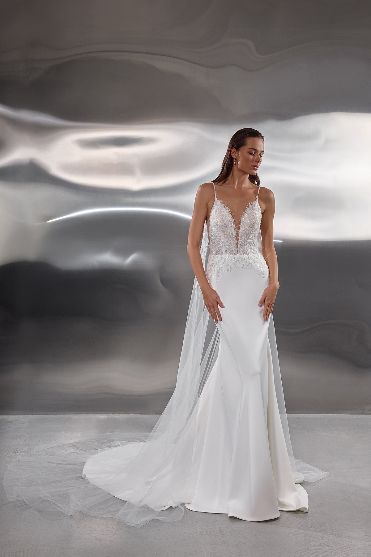 The skirt is made from smooth stretch crepe satin, offering a sleek and modern contrast to the ornate corset. A light tulle cape decorated with lace completes the look, adding ethereal movement and versatile drama for the ceremony.